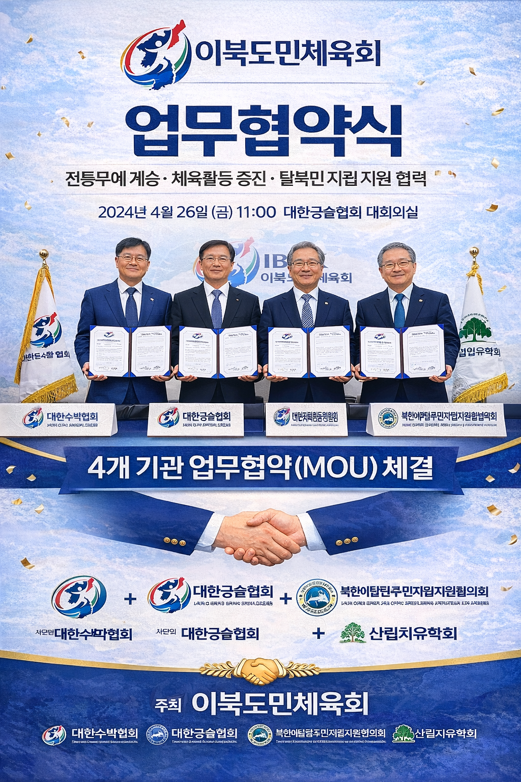 편집부 이북도민체육회, 4개 기관과 업무협약(MOU) 체결 5시간 ago 전통무예 계승·체육활동·정착지원 협력 강화 (송인권 기자)= 이북도민 사회의 화합과 전통문화 계승을 목표로 설립을 추진 중인 이북도민체육회가 관련 단체 및 교육기관과… Read More Next» « Previous