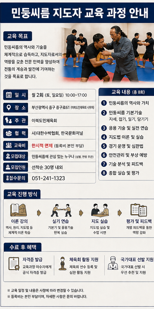 교육은 월 2회 토요일과 일요일에 진행되며, 장소는 부산광역시 중구 중구로61 일대 사무처에서 운영된다. 교육 과정에는 기본 기술, 실전 응용, 지도법, 심판 기초 등이 포함될 예정이다.