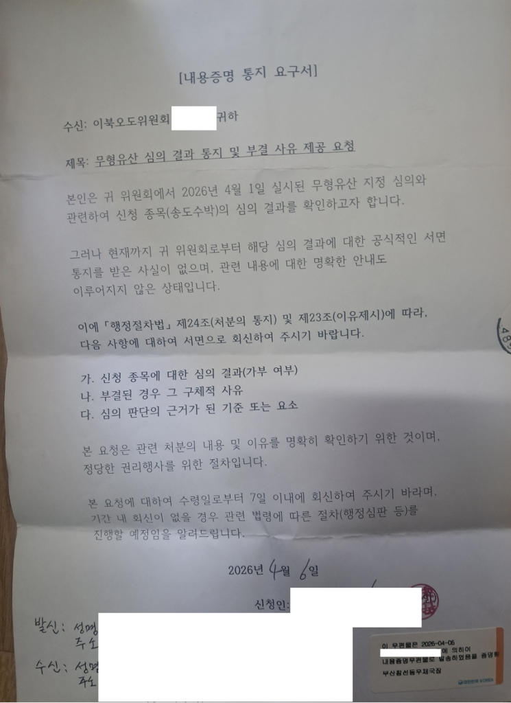1차 내용증명(신청인측은 곧 2차 내용증명을 이북오도위원회에 발송한다고 밝혔다)