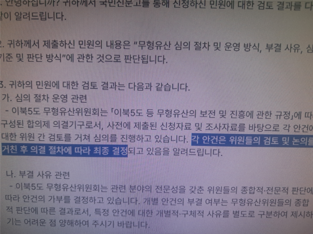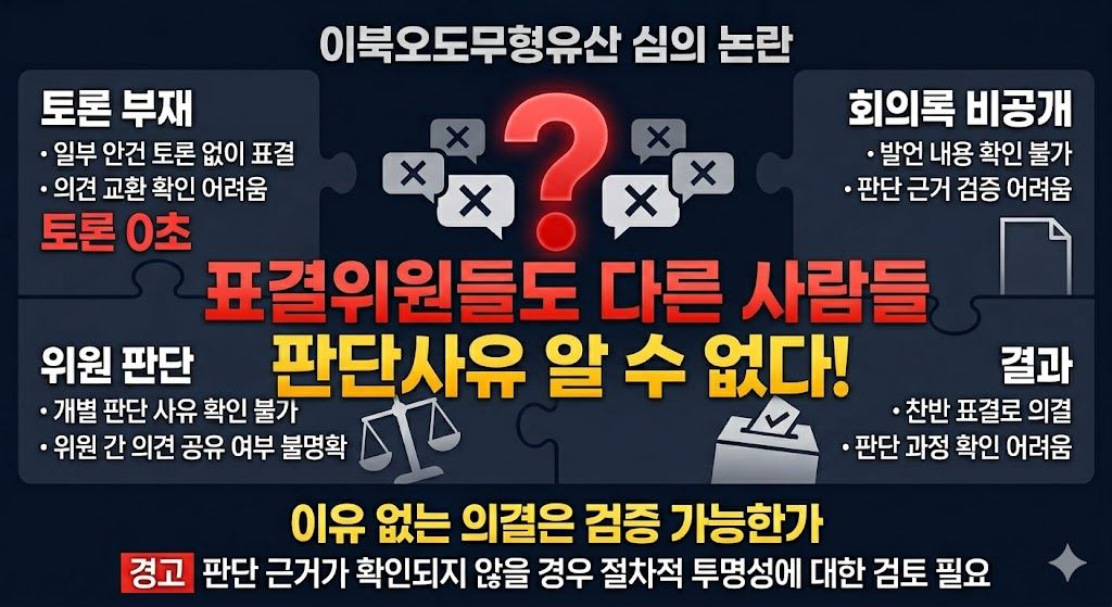 이북오도무형유산 심의 과정에서 일부 안건이 토론 없이 표결로 의결되었다는 정황이 제기되면서, 단순 찬반 중심 의결 구조에 대한 문제 제기가 이어지고 있다.