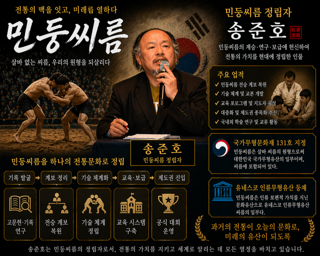송준호 선생이 민둥씨름 복원에 뛰어든 것은 단순히 과거에 대한 호기심 때문이 아니었다. 그는 전통 무예 ‘수박(手搏)’의 전승 과정을 연구하던 중, 수박의 기술 체계 안에 샅바 없이 상대를 제압하는 씨름의 원형이 깊게 박혀 있음을 발견했다.