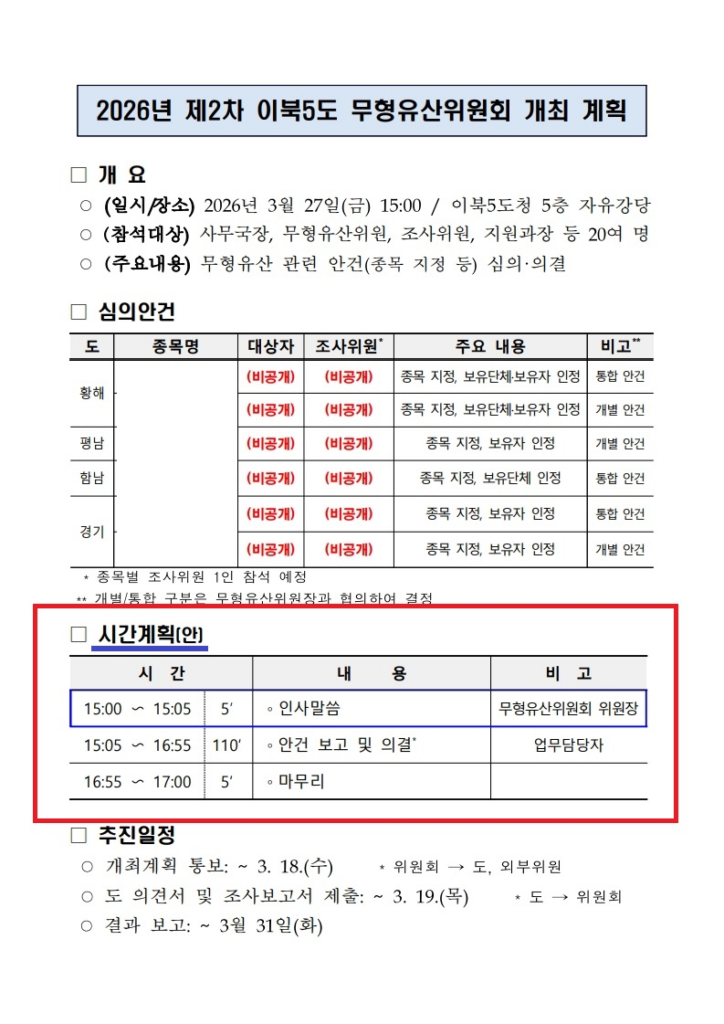 이북오도 무형유산위원회 개최 계획, 하단의 시간계획을 보면 총 2시간중에 안건 토의가 110분 이다. 안건 앞순위 특정 A 안건에 40분 소요했을때 다른 안건들 5개에는 물리적으로 14분씩 배분될 수 있다. 그러나 이마저도 지켜지지 않았으며 송도수박의 경우 토론 0 초였다. 이북오도위원회 담당 공무원은 전화통화에서 총 3시간 가량 회의가 진행됐다고 했으며 개최 계획서상 시간계획 차질로 회의시간이 늘어난듯 하다. 이는 특정 안건 심의로 인한 시간 부족 탓이었을 수 있다. 처음의 시간 계획보다 한시간이 늘어 났다고해도 다른 안건들에 베분될 수 있는 시간은 5개 안건들에 12분씩 더해져 각 안건별(40분 소요된 안건 제외) 총 26분 안배가 되지만 이도 특정 안건에 비해서 현저한 시간 차이가 있다.(전언에 의한 것으로 사실관계와 다를수 있음)